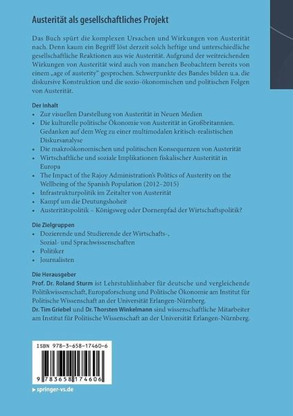 Einleitung.- Zur visuellen Darstellung von Austerität in Neuen Medien.- Die kulturelle politische Ökonomie von Austerität in Großbritannien. Gedanken auf dem Weg zu einer multimodalen kritisch-realistischen Diskursanalyse.- Die makroökonomischen und politischen Konsequenzen von Austerität.- Wirtschaftliche und soziale Implikationen fiskalischer Austerität in Europa.- The Impact of the Rajoy Administration's Politics of Austerity on the Wellbeing of the Spanish Population (2012-2015).- Infrastrukturpolitik im Zeitalter von Austerität.- Kampf um die Deutungshoheit.- Austeritätspolitik - Königsweg oder Dornenpfad der Wirtschaftspolitik?.