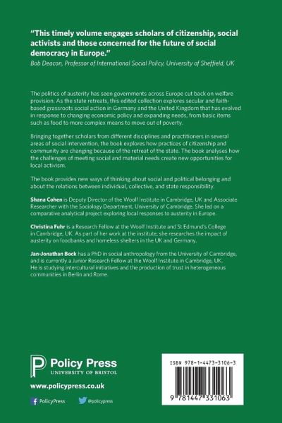 The politics of austerity has seen governments across Europe cut back on welfare provision. As the State retreats, this edited collection explores secular and faith-based grassroots social action in Germany and the United Kingdom that has evolved in response to changing economic policy and expanding needs, from basic items such as food to more complex means to move out of poverty. Bringing together scholars from different disciplines and practitioners in several areas of social intervention, the book explores how the conceptualization and constitutive practices of citizenship and community are changing because of the retreat of the State and the challenge of meeting social and material needs, creating new opportunities for local activism. The book provides new ways of thinking about social and political belonging and about the relations between individual, collective, and State responsibility.