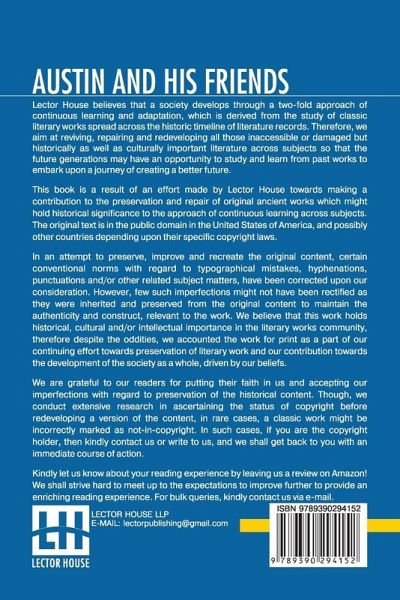 Austin And His Friends This book is a result of an effort made by us towards making a contribution to the preservation and repair of original classic literature. In an attempt to preserve, improve and recreate the original content, we have worked towards: 1. Type-setting & Reformatting: The complete work has been re-designed via professional layout, formatting and type-setting tools to re-create the same edition with rich typography, graphics, high quality images, and table elements, giving our readers the feel of holding a 'fresh and newly' reprinted and/or revised edition, as opposed to other scanned & printed (Optical Character Recognition - OCR) reproductions. 2. Correction of imperfections: As the work was re-created from the scratch, therefore, it was vetted to rectify certain conventional norms with regard to typographical mistakes, hyphenations, punctuations, blurred images, missing content/pages, and/or other related subject matters, upon our consideration. Every attempt was made to rectify the imperfections related to omitted constructs in the original edition via other references. However, a few of such imperfections which could not be rectified due to intentional\unintentional omission of content in the original edition, were inherited and preserved from the original work to maintain the authenticity and construct, relevant to the work. We believe that this work holds historical, cultural and/or intellectual importance in the literary works community, therefore despite the oddities, we accounted the work for print as a part of our continuing effort towards preservation of literary work and our contribution towards the development of the society as a whole, driven by our beliefs. We are grateful to our readers for putting their faith in us and accepting our imperfections with regard to preservation of the historical content. HAPPY READING!