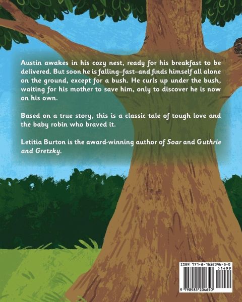 Austin awakes in his cozy nest, ready for his breakfast to be delivered. But soon he is falling-fast-and finds himself all alone on the ground, except for a bush. He curls up under the bush, waiting for his mother to save him, only to discover he is now on his own. Based on a true story, this is a classic tale of tough love and the baby robin who braved it. Letitia Burton is the award-winning author of Soar and Guthrie and Gretzky.