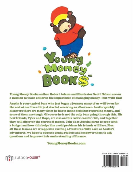 Young Money Books author Robert Adams and illustrator Scott Nelson are on a mission to teach children the importance of managing money-but with fun! Austin is your typical bear who just began a journey many of us will be on for the rest of our lives. He just started receiving an allowance. Austin quickly discovers there are many times he has to make decisions regarding money, and some of them are tough. Of course he is not the only bear going through this. His best friends, Tyler and Hope, are also on this roller-coaster ride, and together they will discover the secrets of money. Join us as Austin learns to cope with a budget and how this helps him avoid problems his friends will face. Plus, all these lessons are wrapped in exciting adventures. With each of Austin's adventures, we hope to educate young readers and empower them to ask questions and improve their understanding of finance. YoungMoneyBooks.com