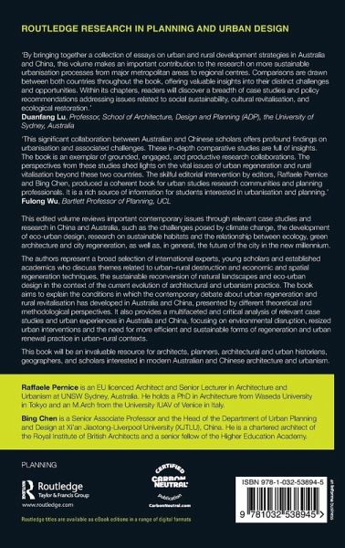 The authors represent a broad selection of international experts, young scholars and established academics who discuss themes related to urban-rural destruction and economic and spatial regeneration techniques, the sustainable reconversion of natural landscapes and eco-urban design in the context of the current evolution of architectural and urbanism practice. The book aims to explain the conditions in which the contemporary debate about urban regeneration and rural revitalisation has developed in Australia and China, presented by different theoretical and methodological perspectives.It also provides a multifaceted and critical analysis of relevant case studies and urban experiences in Australia and China, focusing on environmental disruption, resized urban interventions and the need for more efficient and sustainable forms of regeneration and urban renewal practice in urban-rural contexts.