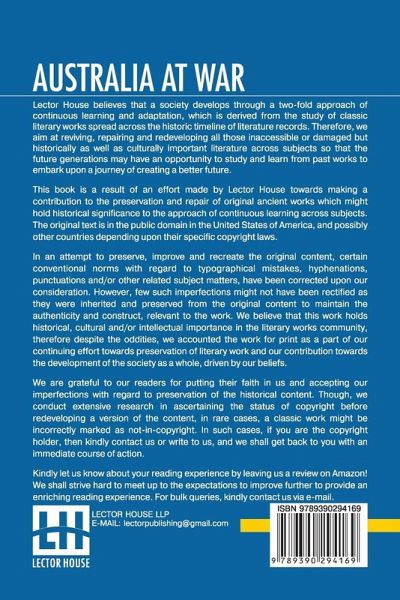 Australia At War: A Winter Record On The Somme And At Ypres During The Campaigns Of 1916 And 1917, With An Introduction By G. K. Chesterton This book is a result of an effort made by us towards making a contribution to the preservation and repair of original classic literature. In an attempt to preserve, improve and recreate the original content, we have worked towards: 1. Type-setting & Reformatting: The complete work has been re-designed via professional layout, formatting and type-setting tools to re-create the same edition with rich typography, graphics, high quality images, and table elements, giving our readers the feel of holding a 'fresh and newly' reprinted and/or revised edition, as opposed to other scanned & printed (Optical Character Recognition - OCR) reproductions. 2. Correction of imperfections: As the work was re-created from the scratch, therefore, it was vetted to rectify certain conventional norms with regard to typographical mistakes, hyphenations, punctuations, blurred images, missing content/pages, and/or other related subject matters, upon our consideration. Every attempt was made to rectify the imperfections related to omitted constructs in the original edition via other references. However, a few of such imperfections which could not be rectified due to intentional\unintentional omission of content in the original edition, were inherited and preserved from the original work to maintain the authenticity and construct, relevant to the work. We believe that this work holds historical, cultural and/or intellectual importance in the literary works community, therefore despite the oddities, we accounted the work for print as a part of our continuing effort towards preservation of literary work and our contribution towards the development of the society as a whole, driven by our beliefs. We are grateful to our readers for putting their faith in us and accepting our imperfections with regard to preservation of the historical content. HAPPY READING!
