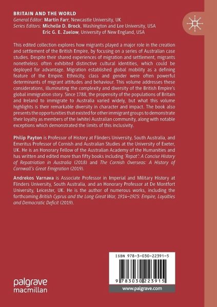 This edited collection explores how migrants played a major role in the creation and settlement of the British Empire, by focusing on a series of Australian case studies. Despite their shared experiences of migration and settlement, migrants nonetheless often exhibited distinctive cultural identities, which could be deployed for advantage. Migration established global mobility as a defining feature of the Empire. Ethnicity, class and gender were often powerful determinants of migrant attitudes and behaviour. This volume addresses these considerations, illuminating the complexity and diversity of the British Empire's global immigration story. Since 1788, the propensity of the populations of Britain and Ireland to immigrate to Australia varied widely, but what this volume highlights is their remarkable diversity in character and impact. The book also presents the opportunities that existed for other immigrant groups to demonstrate their loyalty as members of the (white) Australian community, along with notable exceptions which demonstrated the limits of this inclusivity.
