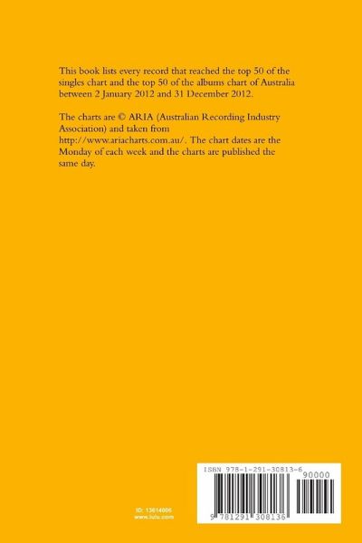 This book lists every record that reached the top 50 of the singles chart and the top 50 of the albums chart of Australia between 2 January 2012 and 31 December 2012. The charts are © ARIA (Australian Recording Industry Association) and taken from http://www.ariacharts.com.au/. The chart dates are the Monday of each week and the charts are published the same day.