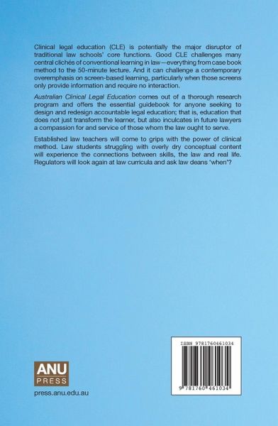 Clinical legal education (CLE) is potentially the major disruptor of traditional law schools' core functions. Good CLE challenges many central clichés of conventional learning in law-everything from case book method to the 50-minute lecture. And it can challenge a contemporary overemphasis on screen-based learning, particularly when those screens only provide information and require no interaction. Australian Clinical Legal Education comes out of a thorough research program and offers the essential guidebook for anyone seeking to design and redesign accountable legal education; that is, education that does not just transform the learner, but also inculcates in future lawyers a compassion for and service of those whom the law ought to serve. Established law teachers will come to grips with the power of clinical method. Law students struggling with overly dry conceptual content will experience the connections between skills, the law and real life. Regulators will look again at law curricula and ask law deans 'when'?