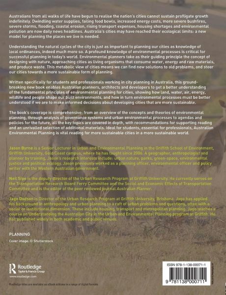 Winner of the Planning Institute of Australia's 2015 Cutting Edge Research and Teaching Award! Australians from all walks of life have begun to realise the nation's cities cannot sustain profligate growth indefinitely. Dwindling water supplies, failing food bowls, increased energy costs, more severe bushfires, severe storms, flooding, coastal erosion, rising transport expenses, housing shortages and environmental pollution are now daily news headlines. Australia's cities may have reached their ecological limits: a new model for planning the places we live is needed. Understanding the natural cycles of the city is just as important to planning our cities as knowledge of local ordinances, indeed much more so. A profound knowledge of environmental processes is critical for successful planning in today's world. Environmental planners take as their guiding principle the concept of designing with nature, approaching cities as living organisms that consume water, energy and raw materials, and produce waste. This metabolic view of cities means we can find new solutions to old problems, and steer our cities towards a more sustainable form of planning. Written specifically for students and professionals working in city planning in Australia, this ground-breaking new book enables Australian planners, architects and developers to get a better understanding of the fundamental principles of environmental planning for cities, showing how land, water, air, energy, wildlife and people shape our built environments, and how in turn environmental processes must be better understood if we are to make informed decisions about developing cities that are more sustainable. The book's coverage is comprehensive: from an overview of the concepts and theories of environmental planning, through analysis of governance systems and urban environmental processes to agendas and policies for the future, all the key topics are covered in depth, with recommendations for supporting reading and an unrivalled selection of additional materials. Ideal for students, essential for professionals, Australian Environmental Planning is vital reading for more sustainable cities in a more sustainable world.