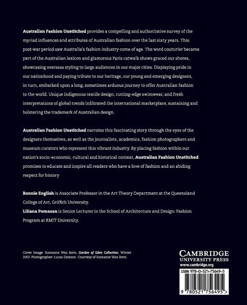 Australian Fashion Unstitched provides a compelling and authoritative survey of the myriad influences and attributes of Australian fashion over the last sixty years. This post-war period saw Australia's fashion industry come of age. The word couturier became part of the Australian lexicon and glamorous Paris catwalk shows graced our shores, showcasing overseas styling to large audiences in our major cities. Displaying pride in our nationhood and paying tribute to our heritage, our young and emerging designers, in turn, embarked upon a long, sometimes arduous journey to offer Australian fashion to the world. Unique indigenous textile design, cutting-edge swimwear, and fresh interpretations of global trends infiltrated the international marketplace, sustaining and bolstering the trademark of Australian design. Australian Fashion Unstitched narrates this fascinating story through the eyes of the designers themselves, as well as the journalists, academics, fashion photographers and museum curators who represent this vibrant industry.