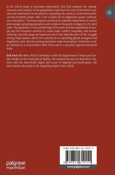In his critical study of Australian imperialism, Erik Paul analyses the making, character and contours of the geopolitical state from the time of the British invasion and colonisation to the present, expanding the country's continental political and economic power. War is the crucible for its hegemonic power, nationalism, and politics. The book exposes and dissects capitalist imperialism to control and manage a growing population and to impose the grand strategy of a US client state. The geopolitics in the partitioning of the earth and the exploitation of people and the biosphere continue to create major conflict, inequality, and human suffering. Australia plays an important role in the intensification of the struggle among major powers and in the outcome of an expanding global ecological and hegemonic crisis. But the existing Australian state of exception constitutes a major obstacle to a reconciliation with China and to a peaceful regional and world order.
