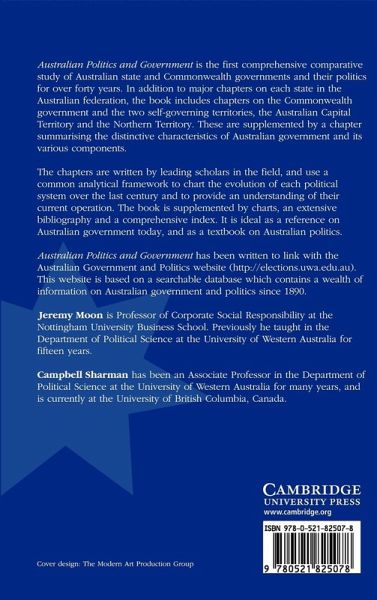 Australian Politics and Government is a comprehensive 2003 comparative study of Australian state and Commonwealth governments and their politics for over forty years. In addition to major chapters on each state in the Australian federation, the book includes chapters on the Commonwealth government and the two self-governing territories. These are supplemented by a chapter summarizing the distinctive characteristics of Australian government and its various components. Australian Politics and Government has been written to link with the Australian Government and Politics website (http://elections.uwa.edu.au). This website is based on a searchable database which contains a wealth of information on Australian government and politics since 1890.