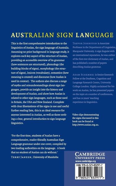 This is first comprehensive introduction to the linguistics of Auslan, the sign language of Australia. Assuming no prior background in language study, it explores each key aspect of the structure of Auslan, providing an accessible overview of its grammar (how sentences are structured), phonology (the building blocks of signs), morphology (the structure of signs), lexicon (vocabulary), semantics (how meaning is created), and discourse (how Auslan is used in context). The authors also discuss a range of myths and misunderstandings about sign languages, provide an insight into the history and development of Auslan, and show how Auslan is related to other sign languages, such as those used in Britain, the USA and New Zealand. Complete with clear illustrations of the signs in use and useful further reading lists, this is an ideal resource for anyone interested in Auslan, as well as those seeking a clear, general introduction to sign language linguistics.