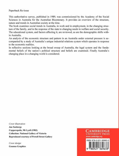 Commissioned for the Australian Bicentenary by the Academy of the Social Sciences in Australia, this 1990 book provides an overview of the structure, nature and trends of Australian society at the time. The 11 essays by leading Australian academics cover issues including families, social security and welfare, education, attitudes and values, population, economy, employment and industrial relations, law, politics, and international relations. Contributors include Brian Crittenden, J. W. Neville, Keith Hancock, James Crawford, and Don Aitkin. Includes notes on contributors, a select bibliography, and an index.