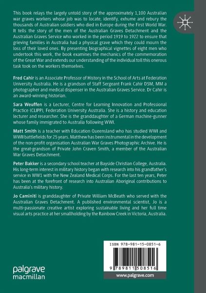 "Their Last Resting Place": Foundations of Graves Work.- The Australian War Graves Effort (1919-1922).- "A Man of Silent Substance": Major John Eldred Mott MC.- "He took pleasure in doing his duty": Staff-Sgt. Frank Cahir DSM, MM.- "Dark in Complexion": The Indigenous War Graves Workers.- "A Credible Officer befallen by Circumstance?" Captain Allen Charles Waters Kingston.- William Frampton McBeath (FC).- Their Legacy.