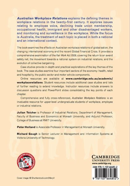 Australian Workplace Relations explains the defining themes in workplace relations in the twenty-first century. It explores issues relating to employee voice, declining trade union membership, occupational health, disadvantaged workers and surveillance in the workplace. The treatment of each topic is placed in both a national and an international context. The book examines the effects on Australian workplace relations of globalisation, the changing international economy and the Global Financial Crisis. It provides a comprehensive examination of the Fair Work Act 2009. Case studies provide in-depth explorations of four important sectors of the economy: health, retail and hospitality, the public sector and motor vehicle components. The textbook includes additional resources for students and lecturers on a companion website: Power-Point slides, lists for further reading, additional case studies and links to websites. Comprehensive and fully cross-referenced, Australian Workplace Relations is an invaluable resource for upper-level undergraduate students of workplace, employee or industrial relations.