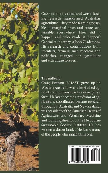 Chance discoveries and world-leading research transformed Australia's agriculture. They made farming possible in marginal areas and more sustainable everywhere. How did it happen and who made it happen? The story starts with earliest discoveries, such as Amos Howard's finding subterranean clover in 1889, through the golden era of research, the spread of annual legumes and the breeding of a new crop, grain lupin, to creating new wine-growing regions such as Margaret River, to the present time. Central to the story is John Gladstones. His research and contributions from scientists, farmers, mad medicos and politicians changed our agriculture and viticulture forever.