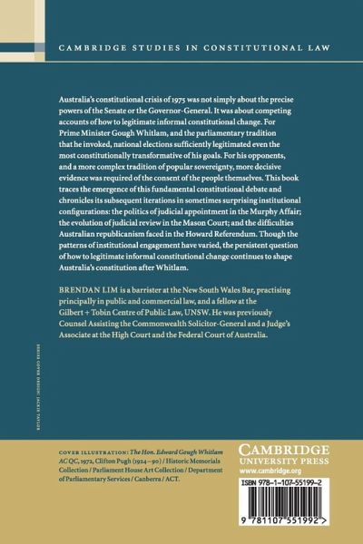 Part 1. Introduction: I. New questions II. The plan Part 2. Informal Constitutional Change: I. The possibility of informal change II. The identification of informal change III. The legitimacy of informal change Part 3. The Whitlam Dismissal: I. The standard narrative II. The dismissal and the constitutional canon III. The higher law narrative IV. Conclusion Part 4. The Murphy Affair: I. Events of 1975-86 II. Murphy and the standard narrative III. Murphy and the higher law narrative IV. Conclusion Part 5. The Mason Court: I. Internal point of view II. Dixon's orthodoxy III. Popular sovereignty foreshadowed: 1962-86 IV. Popular sovereignty ascendant: 1987-95 V. Parliamentary supremacy returns: 1996- VI. Conclusion Part 6. The Howard Referendum: I. Constitutional law and identity II. Whitlam and Republicanism III. Republicanism reinvented IV. Clash of grammars V. Conclusion Part 7. Conclusion.