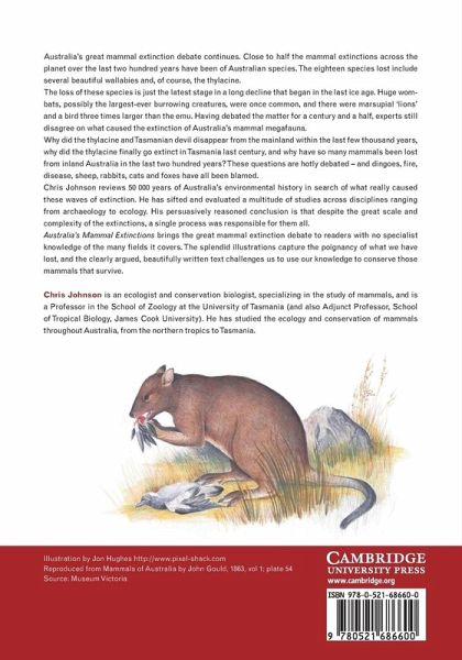 Of the forty mammal species known to have vanished in the world in the last 200 years, almost half have been Australian. Our continent has the worst record of mammal extinctions, with over 65 mammal species having vanished in the last 50 000 years. It began with the great wave of megafauna extinctions in the last ice-age, and continues today, with many mammal species vulnerable to extinction. The question of why mammals became extinct, and why so many became extinct in Australia has been debated by experts for over a century and a half and we are no closer to agreement on the causes. This book introduces readers to the great mammal extinction debate. Chris Johnson takes us on a detective-like tour of these extinctions, uncovering how, why and when they occurred.
