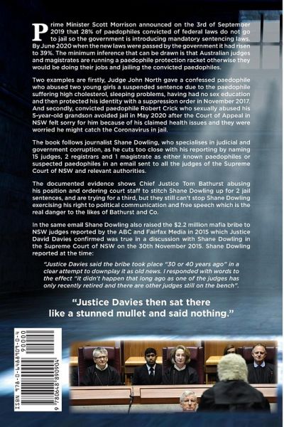 Prime Minister Scott Morrison announced on the 3rd of September 2019 that 28% of paedophiles convicted of federal laws do not go to jail so the government is introducing mandatory sentencing laws. By June 2020 when the new laws were passed by the government it had risen to 39%. The minimum inference that can be drawn is that Australian judges and magistrates are running a paedophile protection racket otherwise they would be doing their jobs and jailing the convicted paedophiles. Two examples are firstly, Judge John North gave a confessed paedophile who abused two young girls a suspended sentence due to the paedophile suffering high cholesterol, sleeping problems, having had no sex education and then protected his identity with a suppression order in November 2017. And secondly, convicted paedophile Robert Crick who sexually abused his 5-year-old grandson avoided jail in May 2020 after the Court of Appeal in NSW felt sorry for him because of his claimed health issues and they were worried he might catch the Coronavirus in jail. The book follows journalist Shane Dowling, who specialises in judicial and government corruption, as he cuts too close with his reporting by naming 15 judges, 2 registrars and 1 magistrate as either known paedophiles or suspected paedophiles in an email sent to all the judges of the Supreme Court of NSW and relevant authorities. The documented evidence shows Chief Justice Tom Bathurst abusing his position and ordering court staff to stitch Shane Dowling up for 2 jail sentences, and are trying for a third, but they still can't stop Shane Dowling exercising his right to political communication and free speech which is the real danger to the likes of Bathurst and Co. In the same email Shane Dowling also raised the $2.2 million mafia bribe to NSW judges reported by the ABC and Fairfax Media in 2015 which Justice David Davies confirmed was true in a discussion with Shane Dowling in the Supreme Court of NSW on the 30th November 2015. Shane Dowling reported at the time: "Justice Davies said the bribe took place "30 or 40 years ago" in a clear attempt to downplay it as old news. I responded with words to the effect "it didn't happen that long ago as one of the judges has only recently retired and there are other judges still on the bench". Justice Davies then sat there like a stunned mullet and said nothing."