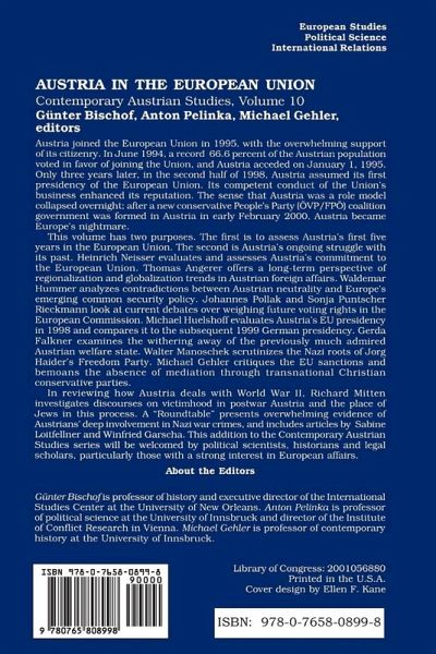 Austria joined the European Union in 1995, with the overwhelming support of its citizenry. In June 1994, a record 66.6 percent of the Austrian population voted in favor of joining the Union, and Austria acceded on January 1, 1995. Only three years later, in the second half of 1998, Austria assumed its first presidency of the European Union. Its competent conduct of the Union's business enhanced its reputation. The sense that Austria was a role model collapsed overnight, after a new conservative People's Party (OVP/FPO) coalition government was formed in Austria in early February 2000. Austria became Europe's nightmare. This volume has two purposes. The first is to assess Austria's first five years in the European Union. The second is Austria's ongoing struggle with its past. Heinrich Neisser evaluates and assesses Austria's commitment to the European Union. Thomas Angerer offers a long-term perspective of regionalization and globalization trends in Austrian foreign affairs. Waldemar Hummer analyzes contradictions between Austrian neutrality and Europe's emerging common security policy. Johannes Pollak and Sonja Puntscher Rieckmann look at current debates over weighing future voting rights in the European Commission. Michael Huelshoff evaluates Austria's EU presidency in 1998 and compares it to the subsequent 1999 German presidency. Gerda Falkner examines the withering away of the previously much admired Austrian welfare state. Walter Manoschek scrutinizes the Nazi roots of Jorg Haider's Freedom Party. Michael Gehler critiques the EU sanctions and bemoans the absence of mediation through transnational Christian conservative parties. In reviewing how Austria deals with World War II,Richard Mitten investigates discourses on victimhood in postwar Austria and the place of Jews in this process. A "Roundtable" presents overwhelming evidence of Austrians' deep involvement in Nazi war crimes, and includes articles by Sabine Loitfellner and Winfried Garscha. T