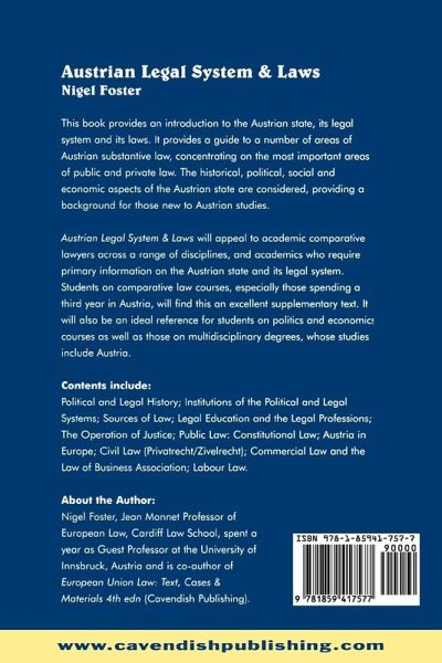 This book provides an introduction to the Austrian state,legal system and laws. It provides a guide to a number of areas of Austrian substantive law, concentrating on the most important areas of public and private law. The book considers in depth, the historical, political, social and economic aspects of the Austrian State to give more background for those coming afresh to Austrian studies. This book will appeal to academic comparative lawyers across a range of disciplines and academics who require fundamental information on the Austrian state and legal systems. It will make attractive supplementary reading on comparative law courses, especially for those students spending a third year in Austria. It will also prove useful for politics and economics or multidisciplinary studies students who study Austria either directly or for comparison with other countries.