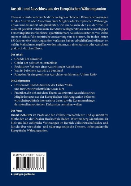 Thomas Schuster untersucht die derzeitigen rechtlichen Rahmenbedingungen für den Austritt oder Ausschluss eines Mitglieds der Europäischen Währungsunion und diskutiert Möglichkeiten, wie ein Ausscheiden aus der EWU in Zukunft gestaltet werden kann. Der Autor schlägt erstmals in der einschlägigen Forschungsliteratur konkrete, quantifizierbare Ausschlusskriterien vor. Dabei stützt er sich auf die empirische Auswertung von 49 Staaten, die in den letzten 150 Jahren eine Währungsunion verlassen haben. Abschließend erläutert er, welche Maßnahmen ergriffen werden müssen, um einen Austritt oder Ausschluss praktisch durchzuführen.