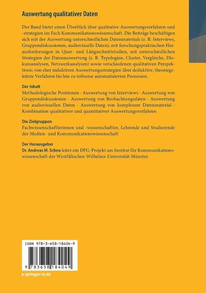 Der Band bietet einen Überblick über qualitative Auswertungsverfahren und -strategien im Fach Kommunikationswissenschaft. Die Beiträge beschäftigen sich mit der Auswertung unterschiedlichen Datenmaterials (z. B. Interviews, Gruppendiskussionen, audiovisuelle Daten), mit forschungspraktischen Herausforderungen in Quer- und Längsschnittstudien, mit unterschiedlichen Strategien der Datenauswertung (z. B. Typologien, Cluster, Vergleiche, Diskursanalysen, Netzwerkanalysen) sowie verschiedenen qualitativen Perspektiven; von eher induktiven Auswertungsstrategien über deduktive, theoriegeleitete Verfahren bis hin zu teilweise automatisierten Prozessen.