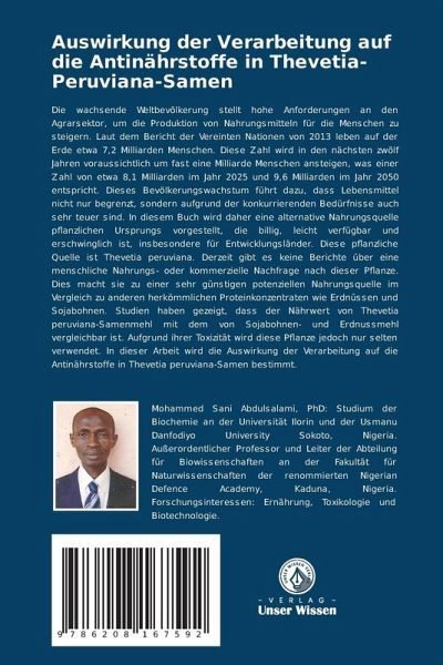 Die wachsende Weltbevölkerung stellt hohe Anforderungen an den Agrarsektor, um die Produktion von Nahrungsmitteln für die Menschen zu steigern. Laut dem Bericht der Vereinten Nationen von 2013 leben auf der Erde etwa 7,2 Milliarden Menschen. Diese Zahl wird in den nächsten zwölf Jahren voraussichtlich um fast eine Milliarde Menschen ansteigen, was einer Zahl von etwa 8,1 Milliarden im Jahr 2025 und 9,6 Milliarden im Jahr 2050 entspricht. Dieses Bevölkerungswachstum führt dazu, dass Lebensmittel nicht nur begrenzt, sondern aufgrund der konkurrierenden Bedürfnisse auch sehr teuer sind. In diesem Buch wird daher eine alternative Nahrungsquelle pflanzlichen Ursprungs vorgestellt, die billig, leicht verfügbar und erschwinglich ist, insbesondere für Entwicklungsländer. Diese pflanzliche Quelle ist Thevetia peruviana. Derzeit gibt es keine Berichte über eine menschliche Nahrungs- oder kommerzielle Nachfrage nach dieser Pflanze. Dies macht sie zu einer sehr günstigen potenziellen Nahrungsquelle im Vergleich zu anderen herkömmlichen Proteinkonzentraten wie Erdnüssen und Sojabohnen. Studien haben gezeigt, dass der Nährwert von Thevetia peruviana-Samenmehl mit dem von Sojabohnen- und Erdnussmehl vergleichbar ist. Aufgrund ihrer Toxizität wird diese Pflanze jedoch nur selten verwendet. In dieser Arbeit wird die Auswirkung der Verarbeitung auf die Antinährstoffe in Thevetia peruviana-Samen bestimmt.