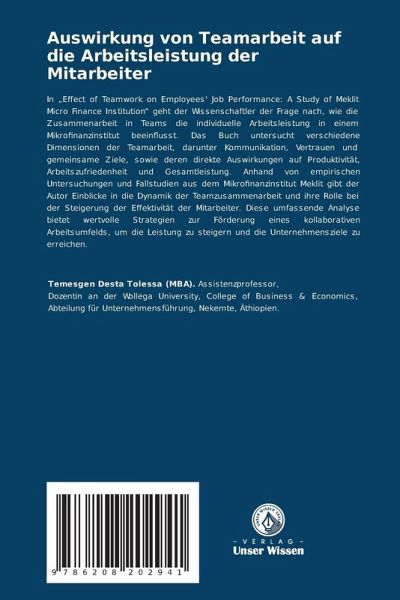 In "Effect of Teamwork on Employees' Job Performance: A Study of Meklit Micro Finance Institution" geht der Wissenschaftler der Frage nach, wie die Zusammenarbeit in Teams die individuelle Arbeitsleistung in einem Mikrofinanzinstitut beeinflusst. Das Buch untersucht verschiedene Dimensionen der Teamarbeit, darunter Kommunikation, Vertrauen und gemeinsame Ziele, sowie deren direkte Auswirkungen auf Produktivität, Arbeitszufriedenheit und Gesamtleistung. Anhand von empirischen Untersuchungen und Fallstudien aus dem Mikrofinanzinstitut Meklit gibt der Autor Einblicke in die Dynamik der Teamzusammenarbeit und ihre Rolle bei der Steigerung der Effektivität der Mitarbeiter. Diese umfassende Analyse bietet wertvolle Strategien zur Förderung eines kollaborativen Arbeitsumfelds, um die Leistung zu steigern und die Unternehmensziele zu erreichen.