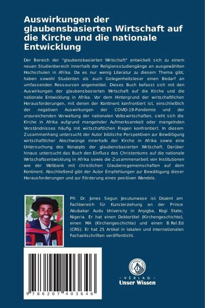 Der Bereich der "glaubensbasierten Wirtschaft" entwickelt sich zu einem neuen Studienbereich innerhalb der Religionsstudiengänge an ausgewählten Hochschulen in Afrika. Da es nur wenig Literatur zu diesem Thema gibt, haben sowohl Studenten als auch Gelegenheitsleser einen Bedarf an umfassenden Ressourcen angemeldet. Dieses Buch befasst sich mit den Auswirkungen der glaubensbasierten Wirtschaft auf die Kirche und die nationale Entwicklung in Afrika. Vor dem Hintergrund der wirtschaftlichen Herausforderungen, mit denen der Kontinent konfrontiert ist, einschließlich der negativen Auswirkungen der COVID-19-Pandemie und der unzureichenden Verwaltung der nationalen Volkswirtschaften, sieht sich die Kirche in Afrika aufgrund mangelnder Aufmerksamkeit oder mangelnden Verständnisses häufig mit wirtschaftlichen Fragen konfrontiert. In diesem Zusammenhang untersucht der Autor biblische Perspektiven zur Bewältigung wirtschaftlicher Abschwünge innerhalb der Kirche in Afrika sowie eine Untersuchung des Konzepts der glaubensbasierten Wirtschaft. Darüber hinaus untersucht das Buch den Einfluss des Christentums auf die nationale Wirtschaftsentwicklung in Afrika sowie die Zusammenarbeit von Institutionen wie der Weltbank mit christlichen Glaubensgemeinschaften auf dem Kontinent. Abschließend gibt der Autor Empfehlungen zur Bewältigung dieser Herausforderungen und zur Förderung eines positiven Wandels.