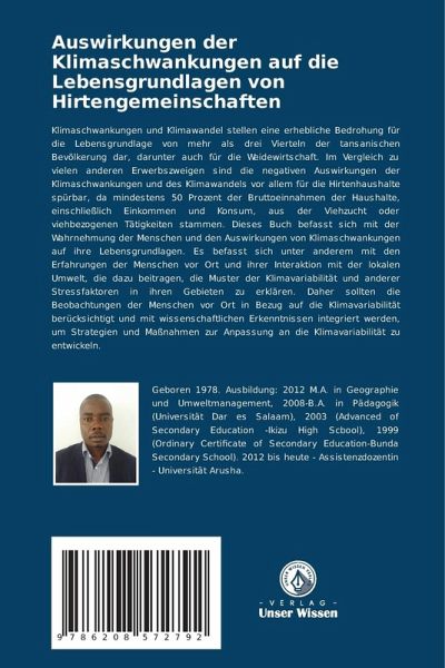 Klimaschwankungen und Klimawandel stellen eine erhebliche Bedrohung für die Lebensgrundlage von mehr als drei Vierteln der tansanischen Bevölkerung dar, darunter auch für die Weidewirtschaft. Im Vergleich zu vielen anderen Erwerbszweigen sind die negativen Auswirkungen der Klimaschwankungen und des Klimawandels vor allem für die Hirtenhaushalte spürbar, da mindestens 50 Prozent der Bruttoeinnahmen der Haushalte, einschließlich Einkommen und Konsum, aus der Viehzucht oder viehbezogenen Tätigkeiten stammen. Dieses Buch befasst sich mit der Wahrnehmung der Menschen und den Auswirkungen von Klimaschwankungen auf ihre Lebensgrundlagen. Es befasst sich unter anderem mit den Erfahrungen der Menschen vor Ort und ihrer Interaktion mit der lokalen Umwelt, die dazu beitragen, die Muster der Klimavariabilität und anderer Stressfaktoren in ihren Gebieten zu erklären. Daher sollten die Beobachtungen der Menschen vor Ort in Bezug auf die Klimavariabilität berücksichtigt und mit wissenschaftlichen Erkenntnissen integriert werden, um Strategien und Maßnahmen zur Anpassung an die Klimavariabilität zu entwickeln.