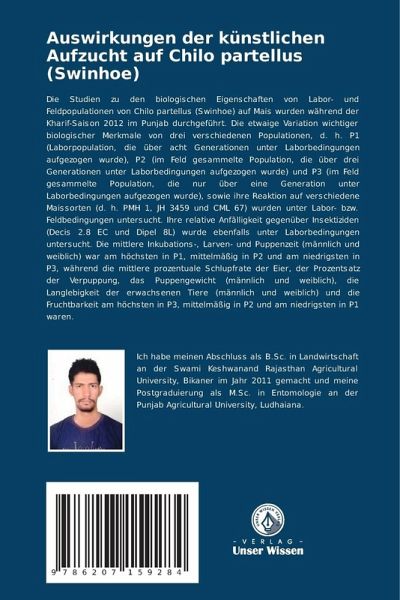 Die Studien zu den biologischen Eigenschaften von Labor- und Feldpopulationen von Chilo partellus (Swinhoe) auf Mais wurden während der Kharif-Saison 2012 im Punjab durchgeführt. Die etwaige Variation wichtiger biologischer Merkmale von drei verschiedenen Populationen, d. h. P1 (Laborpopulation, die über acht Generationen unter Laborbedingungen aufgezogen wurde), P2 (im Feld gesammelte Population, die über drei Generationen unter Laborbedingungen aufgezogen wurde) und P3 (im Feld gesammelte Population, die nur über eine Generation unter Laborbedingungen aufgezogen wurde), sowie ihre Reaktion auf verschiedene Maissorten (d. h. PMH 1, JH 3459 und CML 67) wurden unter Labor- bzw. Feldbedingungen untersucht. Ihre relative Anfälligkeit gegenüber Insektiziden (Decis 2.8 EC und Dipel 8L) wurde ebenfalls unter Laborbedingungen untersucht. Die mittlere Inkubations-, Larven- und Puppenzeit (männlich und weiblich) war am höchsten in P1, mittelmäßig in P2 und am niedrigsten in P3, während die mittlere prozentuale Schlupfrate der Eier, der Prozentsatz der Verpuppung, das Puppengewicht (männlich und weiblich), die Langlebigkeit der erwachsenen Tiere (männlich und weiblich) und die Fruchtbarkeit am höchsten in P3, mittelmäßig in P2 und am niedrigsten in P1 waren.