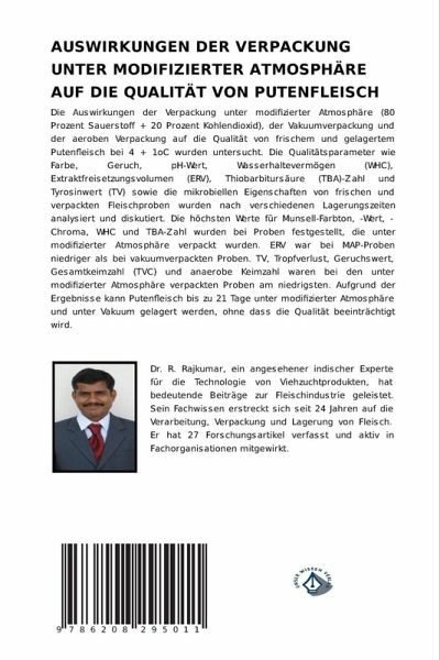 Die Auswirkungen der Verpackung unter modifizierter Atmosphäre (80 Prozent Sauerstoff + 20 Prozent Kohlendioxid), der Vakuumverpackung und der aeroben Verpackung auf die Qualität von frischem und gelagertem Putenfleisch bei 4 + 1oC wurden untersucht. Die Qualitätsparameter wie Farbe, Geruch, pH-Wert, Wasserhaltevermögen (WHC), Extraktfreisetzungsvolumen (ERV), Thiobarbitursäure (TBA)-Zahl und Tyrosinwert (TV) sowie die mikrobiellen Eigenschaften von frischen und verpackten Fleischproben wurden nach verschiedenen Lagerungszeiten analysiert und diskutiert. Die höchsten Werte für Munsell-Farbton, -Wert, -Chroma, WHC und TBA-Zahl wurden bei Proben festgestellt, die unter modifizierter Atmosphäre verpackt wurden. ERV war bei MAP-Proben niedriger als bei vakuumverpackten Proben. TV, Tropfverlust, Geruchswert, Gesamtkeimzahl (TVC) und anaerobe Keimzahl waren bei den unter modifizierter Atmosphäre verpackten Proben am niedrigsten. Aufgrund der Ergebnisse kann Putenfleisch bis zu 21 Tage unter modifizierter Atmosphäre und unter Vakuum gelagert werden, ohne dass die Qualität beeinträchtigt wird.
