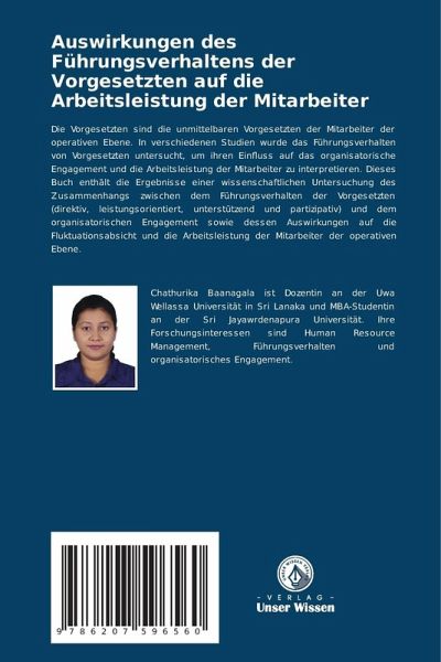 Die Vorgesetzten sind die unmittelbaren Vorgesetzten der Mitarbeiter der operativen Ebene. In verschiedenen Studien wurde das Führungsverhalten von Vorgesetzten untersucht, um ihren Einfluss auf das organisatorische Engagement und die Arbeitsleistung der Mitarbeiter zu interpretieren. Dieses Buch enthält die Ergebnisse einer wissenschaftlichen Untersuchung des Zusammenhangs zwischen dem Führungsverhalten der Vorgesetzten (direktiv, leistungsorientiert, unterstützend und partizipativ) und dem organisatorischen Engagement sowie dessen Auswirkungen auf die Fluktuationsabsicht und die Arbeitsleistung der Mitarbeiter der operativen Ebene.