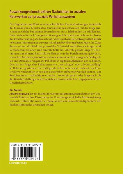 Die Digitalisierung führt zu unterschiedlichen Herausforderungen innerhalb des Journalismus. Konstruktive Journalist:innen setzen sich mit der Frage auseinander, welche Funktionen Journalismus im 21. Jahrhundert zu erfüllen hat. Dabei stehen für sie Lösungsorientierung und Perspektivenreichtum im Fokus der Berichterstattung. Zudem ist es ihr Ziel, durch das Berichten gesellschaftlich relevanter Informationen zu einer mündigen Bevölkerung beizutragen. Im Zuge dessen nimmt die Stärkung prosozialer Selbstwirksamkeitserwartungen und Verhaltensintentionen eine zentrale Rolle ein. Obwohl gerade jüngere Generationen zunehmend konstruktive Elemente in der Berichterstattung fordern, versuchen Medienorganisationen durch aufmerksamkeitserregende Schlagzeilen und Dramatisierungen, ihr Publikum in digitalen Sphären an sich zu binden. Dies hat zur Folge, dass Phänomene wie "news fatigue" oder "doomscrolling" an Relevanz gewinnen. Die vorliegende Arbeit untersucht zunächst, wie konstruktiveNachrichten in sozialen Netzwerken aufbereitet werden können, um Rezipient:innen nachhaltig zu erreichen. Weiterhin geht sie der Frage nach, ob das Berichterstattungsmuster tatsächlich Prosozialität bzw. Engagement in der Gesellschaft fördert.