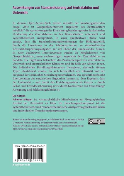 In diesem Open-Access-Buch werden mithilfe der forschungsleitenden Frage: "Wie ist Geographieunterricht angesichts des Zentralabiturs möglich?" die Auswirkungen der Einrichtung beziehungsweise funktionalen Umdeutung des Zentralabiturs in den Bundesländern untersucht und systemtheoretisch interpretiert. In einer quantitativen Studie wird gezeigt, dass die Standardisierungsbemühungen der Bildungspolitik durch die Umsetzung in der Schulorganisation zu standardisierten Zentralabiturprüfungsaufgaben auf der Ebene der Bundesländer führen. In einer qualitativen Interviewstudie werden die Möglichkeiten von Geographielehrer_innen nachvollzogen, angesichts des Zentralabiturs zu handeln. Die Ergebnisse beleuchten das Zusammenspiel von Zentralabitur, Unterricht und unterrichtlichen Klausuren und die Rolle von Akteur_innen. Die individuellen Handlungsphänomene divergieren, dennoch können Typen identifiziert werden, die sich hinsichtlich der Intensität und der Frequenz der schulischen Gestaltungunterscheiden. Die systemtheoretische Interpretation der empirischen Ergebnisse kommt zu dem Ergebnis, dass der Unterricht - und damit das Erziehungssystem als Ganzes - durch Selbst- und Fremdbeschränkung sowie durch Konkurrenz von Vermittlung/Aneignung und Selektion gefährdet ist.