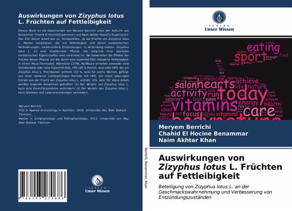 Dieses Buch ist die Diplomarbeit von Meryem Berrichi unter der Aufsicht von Benammar Chahid El Hocine(Supervisor) und Naim Akhtar khan(Co-Supervisor). Das Ziel dieser Arbeit war es, festzustellen, ob die Früchte von Zizyphus lotus L. Marker modulieren, die mit Fettleibigkeit und deren metabolischen Veränderungen, insbesondere Entzündungen, in Verbindung stehen. Zizyphus lotus L. ist eine mediterrane Pflanze, die aufgrund ihrer positiven medizinischen Eigenschaften weit verbreitet ist. Wir bewerteten die Effekte der Früchte dieser Pflanze auf die durch eine Hyperfett-Diät induzierte Fettleibigkeit in einem Maus-Tiermodell. Männliche C57BL /6J-Mäuse erhielten entweder eine Standarddiät oder eine Hyperfett-Diät, HFD (30 % Palmöl, w/v) oder HFD, die ein Zizyphus lotus L. Fruchtpulver enthielt. (10 %, w/w) für sechs Wochen, gefolgt von einer weiteren sechswöchigen Periode mit HFD, die einen wässrigen Extrakt aus der Frucht von Zizyphus lotus L. enthält. (1%, w/v). Für diese Arbeit wurden folgende Annahmen getroffen: (1) Der Verzehr von Zizyphus lotus L. kann eine Gewichtszunahme verhindern; (2) Der Verzehr von Zizyphus lotus L. kann Diabetes und Lebererkrankungen verhindern.