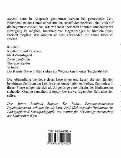 Auszeit kann in Anspruch genommen werden bei gemessener Zeit. Nachdem uns das Ganze unbekannt ist, schafft der ausdrückliche Blick auf die begrenzte Auszeit das, was wir sonst übersehen könnten: Innehalten der Bewegung ist möglich, innerhalb von Begrenzungen ist hier ein Stück Freiheit möglich. Wir könnten sie dazu verwenden, mit neuen Ideen zu spielen. Kindheit, Rhythmus und Einklang, Merk-Würdigkeit, ZwischenZeiten, Therapie Zyklus, Träume u.a. stehen als Kapitelüberschriften oder als Wegmarken in einer Textlandschaft. Die Abhandlung wendet sich an Leserinnen und Leser, die sich für den benötigten Zeitraum der Lektüre eine Auszeit gönnen wollen. Zumindest in dieser Phase mögen sie sich als Angehörige einer abseits des Mainstreams stehenden Gruppe verstehen. A happy few, sie verfügen über Zeit, also sich selbst.