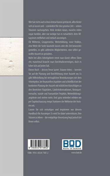 Wer hat nicht auch schon einmal davon geträumt, alles hinter sich zu lassen und - zumindest für eine gewisse Zeit - seinen Träumen nachzugehen? Viele denken daran,aber nur wenige tun es tatsächlich: dem Alltagstrott entfliehen und einfach aussteigen. Ob Weltreise, Gruppenreise, Weiterbildung, neue Hobby oder einfach eine Weile die Seele baumeln lassen, es gibt zahlreiche Möglichkeiten, eine Auszeit zu gestalten. Nicht bei allen Arbeitgebern rennt man damit offene Türen ein; manchmal braucht man Durchhaltevermögen, doch es lohnt sich auf jeden Fall.Dieses Buch - dessen Tenor lautet: Träume leben - bereitet Sie auf die Planung und Durchführung einer Auszeit vor. Es gibt Hilfestellung bei vertraglichen Vereinbarungen mit dem Arbeitgeber, bei finanziellen Aspekten und schließlich bei der konkreten Planung der Auszeit mit nützlichen Ratschlägen zu den Bereichen Flugtickets, Länderinformationen, Reisepartnersuche, soziale und humanitäre Projekte, Weiterbildungsangebote und vielem mehr.Und ganz nebenbei erleben wir per Tagebuchauszug einige Stationen der Weltreise der Autorin mit.Lassen Sie sich ermutigen und inspirieren - die endgültige Umsetzung liegt jedoch bei Ihnen selbst.