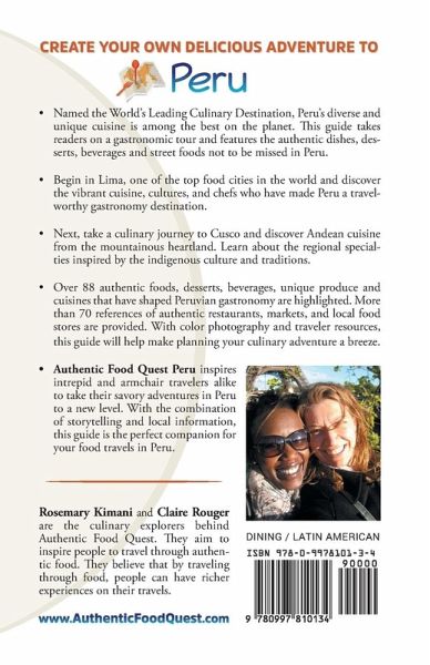 Create Your Own Delicious Adventure to Peru Are you looking for a local and authentic experience of Peru? Do you want to taste the local cuisine and regional specialties? Do you struggle to find the local and authentic dishes? Do you fear missing out on the best local dishes? Are you tired of finding yourself at the same restaurants recommended by all guidebooks? Authentic Food Quest Peru: A Guide to Eat Your Way Authentically Through Lima and Cusco takes you on a culinary journey through Lima and Cusco, two of the top food cities in Peru. What you will find: In this guide, you will discover the major cuisine types in Peru, along with descriptions of the typical dishes, desserts, beverages, street foods and unique produce. Also included is an overview of the farmers markets and local stores, restaurants, and local producers worth visiting. Along the way, popular food festivals are noted and resources for traveling through Peru are also provided. With more than 160 references, you have everything you need to launch your own food adventure. You will discover: Over 88 iconic cuisines, dishes and drinks and what makes them special to Peru Where to find authentic restaurants and avoid the tourist traps Street foods to sample and eat like a local Unique produce that shape Peruvian gastronomy Excerpts from interviews with local chefs and food journalists Tips to stay fit and healthy on your travels to Peru Authentic Food Quest Peru: A Guide to Eat Your Way Authentically Through Lima and Cusco inspires intrepid and armchair travelers alike to take their savory adventures in Peru to a new level. With the combination of storytelling and local information, this guide is the perfect companion for your food travels in Peru. With Authentic Food Quest Peru, get ready for your most delicious and memorable trip ever!