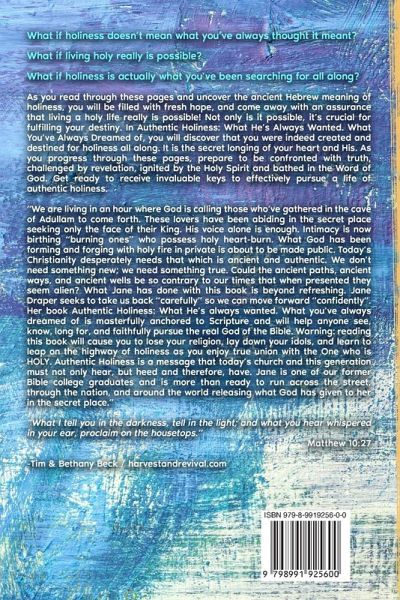 What if holiness doesn't mean what you've always thought it meant? What if living holy really is possible?What if holiness is actually what you've been searching for all along?As you read through these pages and uncover the ancient Hebrew meaning of holiness, you will be filled with fresh hope and come away with an assurance that living a holy life really is possible! Not only is it possible, it's crucial for fulfilling your destiny. In Authentic Holiness: What He's Always Wanted. What You've Always Dreamed of, you will discover that you were indeed created and destined for holiness all along. It is the secret longing of your heart and His. As you progress through these pages, prepare to be confronted with truth, challenged by revelation, ignited by the Holy Spirit and bathed in the Word of God. Get ready to receive invaluable keys to effectively pursue a life of authentic holiness.