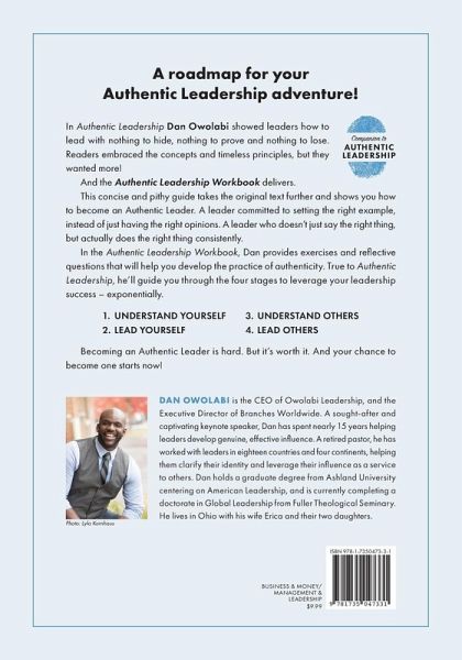 A roadmap for your Authentic Leadership adventure! In Authentic Leadership Dan Owolabi showed leaders how to lead with nothing to hide, nothing to prove and nothing to lose. Readers embraced the concepts and timeless principles, but they wanted more! And the Authentic Leadership Workbook delivers. This concise and pithy guide takes the original text further and shows you how to become an Authentic Leader. A leader committed to setting the right example, instead of just having the right opinions. A leader who doesn't just say the right thing, but actually does the right thing consistently. In the Authentic Leadership Workbook, Dan provides exercises and reflective questions that will help you develop the practice of authenticity. True to Authentic Leadership, he'll guide you through the four stages to leverage your leadership success - exponentially. 1. UNDERSTAND YOURSELF 2. LEAD YOURSELF 3. UNDERSTAND OTHERS 4. LEAD OTHERS Becoming an Authentic Leader is hard. But it's worth it. And your chance to become one starts now! Dan Owolabi is the CEO of Owolabi Leadership, and the Executive Director of Branches Worldwide. A sought-after and captivating keynote speaker, Dan has spent nearly 15 years helping leaders develop genuine, effective influence. A retired pastor, he has worked with leaders in eighteen countries and four continents, helping them clarify their identity and leverage their influence as a service to others. Dan holds a graduate degree from Ashland University centering on American Leadership, and is currently completing a doctorate in Global Leadership from Fuller Theological Seminary. He lives in Ohio with his wife Erica and their two daughters.