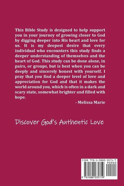 This Bible Study is designed to help support you in your journey of growing closer to God by digging deeper into His heart and love for us. It is my deepest desire that every individual who encounters this study finds a deeper understanding of themselves and the heart of God. This study can be done alone, in pairs, or groups, but it is best when you can be deeply and sincerely honest with yourself. I pray that you find a deeper level of love and appreciation for God and that it makes the world around you, which is often in a dark and scary state, somewhat brighter and filled with hope. - Melissa Marie Discover God's Authentic Love
