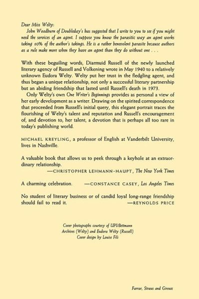 In May 1940, Diarmuid Russell, partner in a newly-launched literary agency, wrote to a relatively unknown Eudora Welty, offering to become her agent. This elegant portrait traces Welty's development as a writer and Russell's encouragement of, and devotion to, her talent. Photographs. "Beyond the portrait of an admirable relationship between author and agent, this work provides insight into the publishing world, the early views and prejudices toward short stories and writers from the South, the obstacles to getting published, and the individual struggles and writing habits of Welty. An enjoyable and enlightening contribution to literary history." - Library Journal