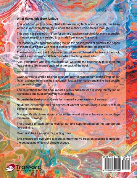 What Makes this Book Unique This nonfiction picture book, filled with fascinating facts about animals, has been written in a conversational style where the author's voice shines through. This book is a great teaching tool for primary teachers searching for many examples of measurement facts related to animals from around the world. For teachers looking for fascinating fact on the classification of animals, the pages of this book are filled with record breakers from each animal classification. The illustrations and the fluid painting techniques explained at the back of the book make it a must-have for all teachers when teaching visual arts. Also, youngsters who love visual arts will welcome the opportunity to explore the fluid painting techniques outlined at the back of the book.