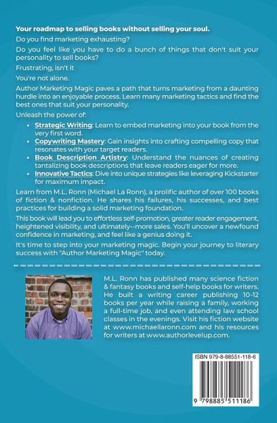 Your roadmap to selling books without selling your soul. Do you find marketing exhausting? Do you feel like you have to do a bunch of things that don't suit your personality to sell books? Frustrating, isn't it? You're not alone. Author Marketing Magic paves a path that turns marketing from a daunting hurdle into an enjoyable process. Learn many marketing tactics and find the best ones that suit your personality. Unleash the power of: ¿Strategic Writing: Learn to embed marketing into your book from the very first word. ¿Copywriting Mastery: Gain insights into crafting compelling copy that resonates with your target readers. ¿Book Description Artistry: Understand the nuances of creating tantalizing book descriptions that leave readers eager for more. ¿Innovative Tactics: Dive into unique strategies like leveraging Kickstarter for maximum impact. Learn from M.L. Ronn (Michael La Ronn), a prolific author of over 100 books of fiction & nonfiction. He shares his failures, his successes, and best practices for building a solid marketing foundation. This book will lead you to effortless self-promotion, greater reader engagement, heightened visibility, and ultimately--more sales. You'll uncover a newfound confidence in marketing, and feel like a genius doing it. It's time to step into your marketing magic. Begin your journey to literary success with Author Marketing Magic today. V1.0