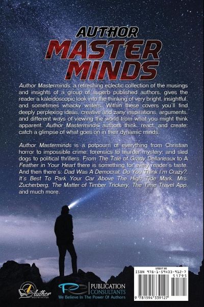 Author Masterminds, a refreshing eclectic collection of the musings and insights of a group of superb published authors, gives the reader a kaleidoscopic look into the thinking of very bright, insightful, and sometimes whacky writers. Within these covers you'll find deeply perplexing ideas, creative and zany inspirations, arguments, and different ways of viewing the world from what you might think apparent. Author Masterminds' authors think, react, and create; catch a glimpse of what goes on in their dynamic minds. Author Masterminds is a potpourri of everything from Christian horror to impossible crime; forensics to murder mystery; and sled dogs to political thrillers. From The Tale of Grady Dellaneaux to A Feather in Your Heart there is something for every reader's taste. And then there's: Dad Was A Democrat, Do You Think I'm Crazy?, It's Best To Park Your Car Above The High Tide Mark, Mrs. Zucherberg, The Matter of Timber Trickery, The Time Travel App, and much more.
