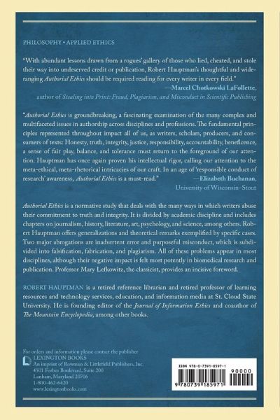 Authorial Ethics is a normative study that deals with the many ways in which writers abuse their commitment to truth and integrity. It is divided by academic discipline and includes chapters on journalism, history, literature, art, psychology, and science, among others. Robert Hauptman offers generalizations and theoretical remarks exemplified by specific cases. Two major abrogations are inadvertent error and purposeful misconduct, which is subdivided into falsification, fabrication, and plagiarism. All of these problems appear in most disciplines, although their negative impact is felt most potently in biomedical research and publication. Professor Mary Lefkowitz, the classicist, provides an incisive foreword.