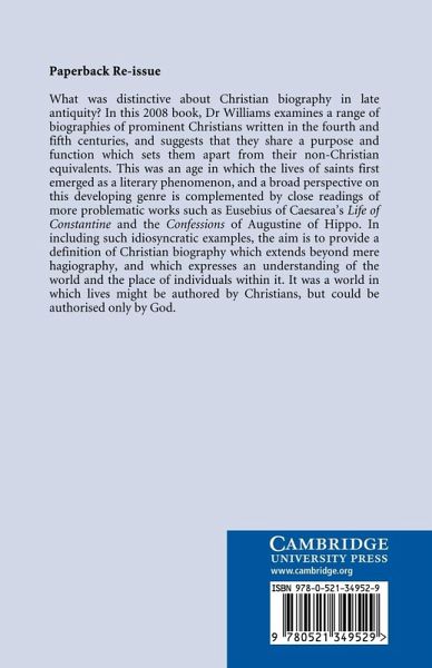 What was distinctive about Christian biography in late antiquity? In this book, Dr Williams examines a range of biographies of prominent Christians written in the fourth and fifth centuries, and suggests that they share a purpose and function which sets them apart from their non-Christian equivalents. This was an age in which the lives of saints first emerged as a literary phenomenon, and a broad perspective on this developing genre is complemented by close readings of more problematic works such as Eusebius of Caesarea's Life of Constantine and the Confessions of Augustine of Hippo. In including such idiosyncratic examples, the aim is to provide a definition of Christian biography which extends beyond mere hagiography, and which expresses an understanding of the world and the place of individuals within it. It was a world in which lives might be authored by Christians, but could be authorised only by God.