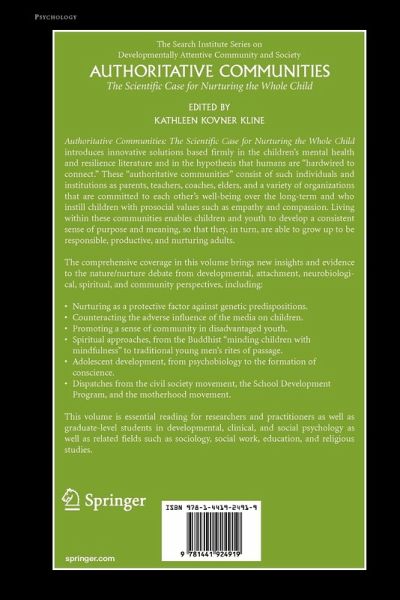 Authoritative Communities: The Scientific Case for Nurturing the Whole Child introduces innovative solutions based firmly in the children's mental health and resilience literature and in the hypothesis that humans are "hardwired to connect." These "authoritative communities" consist of such individuals and institutions as parents, teachers, coaches, elders, and a variety of organizations that are committed to each other's well-being over the long-term and who instill children with prosocial values such as empathy and compassion. Living within these communities enables children and youth to develop a consistent sense of purpose and meaning, so that they, in turn, are able to grow up to be responsible, productive, and nurturing adults.