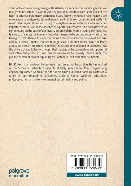 This book comments on growing authoritarianism in democracy and suggests how it ought to be instead. It asks if some degree of authoritarianism is the need of the hour to address potentially existential issues facing the human race. Readers are encouraged to analyse the state of democracy in their own countries and verify if it meets their expectations, or if it is just a myth or an imposter, or a necessary but imperfect compulsion in the absence of a perfect alternative. The book presents a commentary on the state of democracy in some of the world's leading democracies. It aims to challenge the human mind, which seems to be getting accustomed to not having to think, thanks to a constant bombardment of information-real and fake and in-between-that it receives through social and print media, which is freely accessible through smartphone to which it has become addicted. It discusses how the drivers of capitalism - through their business-like connections with powerful and influential politicians and celebrities-could be cleverly manipulating the gullible human mind and exploiting the system to their own material benefit.